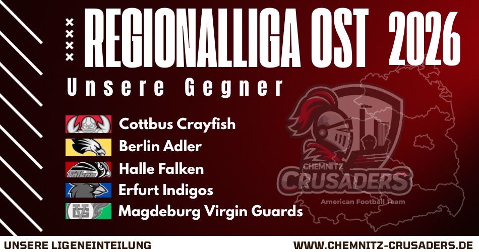 Nach der Meisterschaft im vergangenen Jahr und dem nach der Absage der Relegation durch die Berlin Thunderbirds damit verbundenem Aufstiegsrecht kehren die Chemnitz Crusaders nun nach 17 Jahren zurück in die Regionalliga. Dort wartet eine interessante Gegnerschaft auf das ambitionierte Chemnitzer Team. Insgesamt umfasst die Liga sechs Teams mit neuen und alten Gegnern: