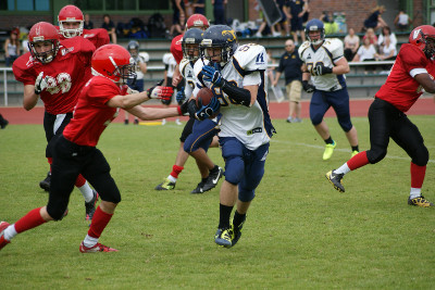 Nach fast zwei Jahren ohne Sieg kehrten die Chemnitz Varlets am heutigem Sonntag endlich wieder mit einem Sieg nach Hause zurück. Bei den Berlin Kobras Juniors stand es am Ende 27:18 (12:0/0:13/6:14/0:0) aus Sicht der Chemnitz Varlets. Dabei begann das Spiel für die nur mit Minimalbesetzung angetretenen Chemnitzer Jungs mit einer großen Herausforderung. Bereits im ersten Spielzug des ersten Viertels liefen die Berliner einen Touchdown zum 0:6 heraus. Kurz vor Ende des Viertels erhöhten die Berliner auf 0:12. Beide Male wurde eine Two-Point-Conversion verhindert. Die richtige Antwort darauf lieferte kurz nach dem Seitenwechsel 11-Yard-Pass von Quarterback Turan Seelig (#88) auf Maik Künzer (#40) zum Touchdown. Mit dem ebenfalls von Maik Künzer (#40) erzielten Zusatzpunkt verkürzten die Varlets auf 7:12. Nachjustierungen in der Defense der Varlets führten nun zum gewünschten Erfolg und keinen Punkten auf Berliner Seite. Wieder war es nun ein Passspielzug, der den Erfolg brachte. Quarterback Turan Seelig (#88) warf einen 58-Yard-Pass auf Maik Künzer (#40), der zum Touchdown fing. Diesmal klappte der Zusatzpunktversuch nicht und es ging mit einer 13:12-Führung der Varlets in die Halbzeitpause. Sofort danach kamen die Varlets in Ballbesitz und machten es wie die Kobras zu Spielbeginn - erster Spielzug, ein Laufspielzug, Touchdown. Turan Seelig (#88) war für die Varlets erfolgreich. Maik Künzer (#40) erhöhte mit dem Zusatzpunkt auf 20:12. Die Kobras waren trotz des Doppelschlags vor und nach der Pause natürlich noch immer gefährlich. Ein 72-Yard-Pass zum Touchdown und schon stand es nur noch 20:18. Der folgende Onside-Kick brachte aber die Varlets in gute Ausgangsposition, die schlussendlich mit einem Lauf von Vladimir Kislicyn (#87) über mehr als 40 Yards zum Touchdown genutzt werden konnte. Der Extrapunkt von Maik Künzer (#40) zum 27:18 markierte gleichzeitig auch schon den Endstand der Partie, denn im vierten Viertel konnte keines der beiden Team sich noch entscheidend durchsetzen. Umso größer war nach dem Spiel der Jubel auf der Chemnitzer Seite. Schließlich wurde eine lange Durststrecke beendet und auch der direkte Vergleich mit den Berlinern gewonnen. Darüber hinaus boten alle Spieler eine sehr gute Leistung und das obwohl einige Spieler sowohl in Offense als auch Defense spielten bzw. sogar auf Positionen, die sie vorher noch nie gespielt hatten.
