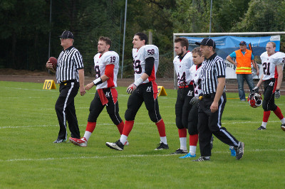 Vom Auswärtsspiel am heutigen Sonntag bei den Wernigerode Mountain Tigers kehrten die Chemnitz Crusaders mit 6:17 (0:7/6:7/0:0/0:3) mit einer Niederlage zurück. Nachdem kurzem Abtasten gelang es zunächst den Crusaders den Ball nach einem Fumble der Mountain Tigers zu erobern, vergaben aber sofort wieder bei einer Interception die gute Ausgangsposition. Diese Chance ließen sich nun die Gastgeber nicht entgehen und gingen mit einem Touchdown durch Marcus Francis (#16) plus Extrapunkt in Führung. Auch im zweiten Viertel brachten sich die Crusaders wieder mit einer Interception von Safety Martin Krüger (#44) in eine gute Ausgangsposition und konnten sie wiederum nicht nutzen. Besser machten es wieder die Wernigerode Mountain Tigers und bauten ihre Führung mit einem Touchdown durch Johannes Herrschaft (#21) auf 14:0 aus. Zum Ende des Viertels konnten sich die Crusaders dann gut über das Feld arbeiten und erzielten in den Schlusssekunden mit einem 3-Yard-Lauf von Quarterback Jan Doant (#19) einen Touchdown. Der Extrapunktversuch wurde geblockt, so dass es mit 6:14 in die Halbzeitpause ging. Nach der Halbzeitpause wurde das Spiel zunehmend von Strafen unterbrochen. Negativer Höhepunkt war der Platzverweis für Johannes Herrschaft (#21) von den Mountain Tigers. Doch Punkte gelangen keinem Team. Erst im vierten Viertel kamen zumindest die Gastgeber noch einmal mit einem Field Goal zu Punkten. Andreas Janko (#89) erzielte die drei Punkte zum Endstand von 6:17 aus Sicht der Crusaders, denn weitere Angriffsbemühungen waren nicht mehr erfolgreich. Die Defense der Crusaders wusste im Spiel durchaus zu Gefallen und den Gegner einige Male unter Druck setzen. Doch das reichte am Ende nicht aus, da es der Offense hingegen nur selten gelang, ihr wirkliches Potential zu zeigen. Während die Mountain Tigers mit dem Sieg ihren ersten Platz in der Gruppe A der Oberliga Ost festigten, benötigen die Crusaders im letzten Spiel noch einen Sieg, um das Saisonziel einer 'winning season' noch zu erreichen.