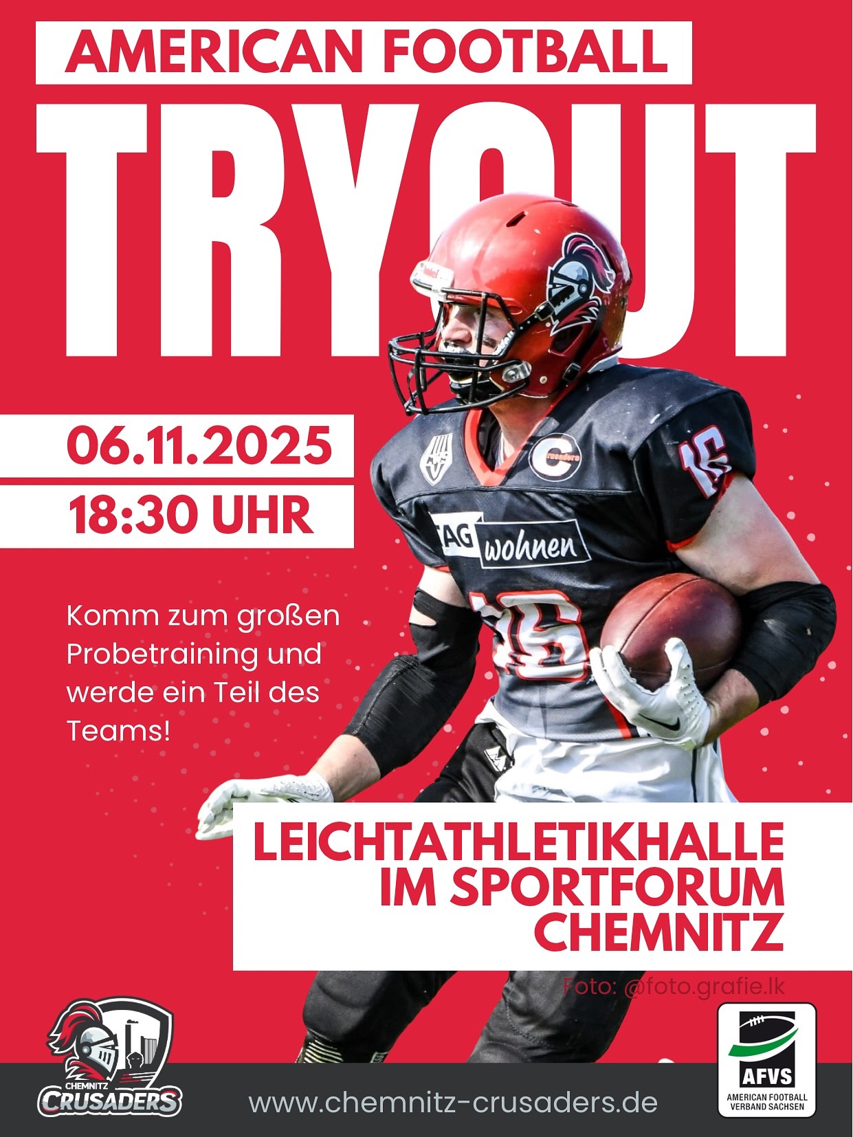 Seit einem Monat ist nun die Saison 2025 für die Chemnitz Crusaders bereits Geschichte. Und was für eine Saison das war - Aufstieg in die Regionalliga nach einer perfekten Saison! Aber auch die Ergebnisse aller anderen Teams waren aller Ehren wert. Bald wird es wieder Zeit, den Blick auf die kommende Saison zu werfen. Denn mit dem Start in das Wintertraining beginnt die Vorbereitung auf die kommende Saison 2026. Traditionell erfolgt mit dem offiziellen Start in das Wintertraining auch das alljährliche Tryout (Probetraining) gemeinsam für alle Teams und Altersklassen. In diesem Jahr findet es am Donnerstag, den 6. November, statt. Die vergangenen Jahre haben es deutlich gezeigt, um in der Liga erfolgreich mitspielen zu können, ist eine ordentliche Kadertiefe erforderlich. Dies gilt insbesondere nun auch mit dem Aufstieg der Chemnitz Crusaders in die Regionalliga, wo starke Gegner und große Herausforderungen warten. Egal ob Du Neueinsteiger bist oder ob Du mit Deiner aktuellen Sportart unzufrieden bist oder ob Du bereits Erfahrung auf dem Football-Feld gesammelt hast - wir bringen dir alles bei, was du brauchst. Zeig uns, was Du drauf hast! Komm vorbei, lerne uns kennen und werde Teil der Regionalliga-Reise 2026!