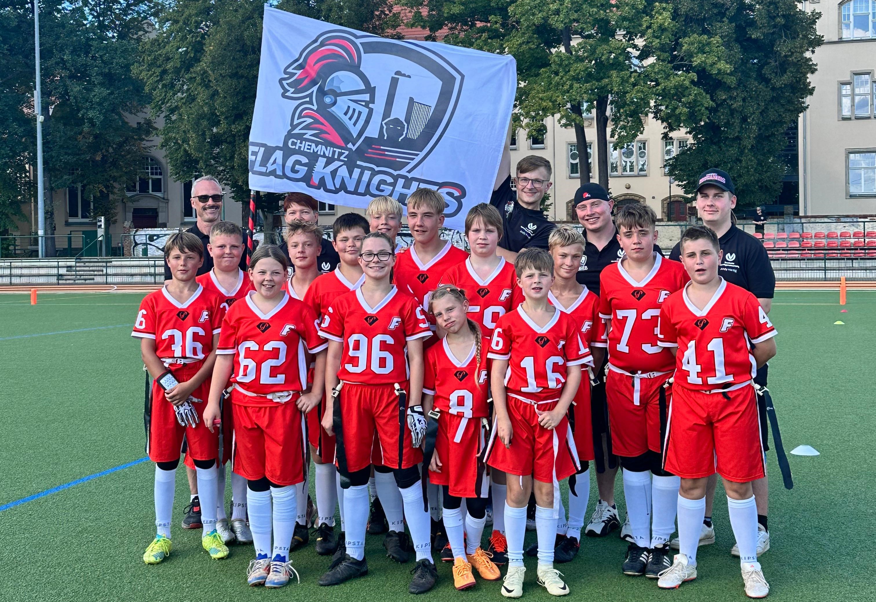 Die erste U13 Saison ist für die Chemnitzer Flag Knights nun beendet, doch müssen wir noch auf den letzten Spieltag in Jena warten, um ein finales Ergebnis verkünden zu können. Auf jeden Fall sind wir Coaches stolz auf alle Flaggies, die zu dieser tollen Saison beigetragen haben. Jeder hat sein Bestes gegeben und sich in vielen Bereichen weiterentwickelt. Wir konnten viele neue Flaggies integrieren und freuen uns nun auf die kommende Zeit, um uns weiterzuentwickeln.