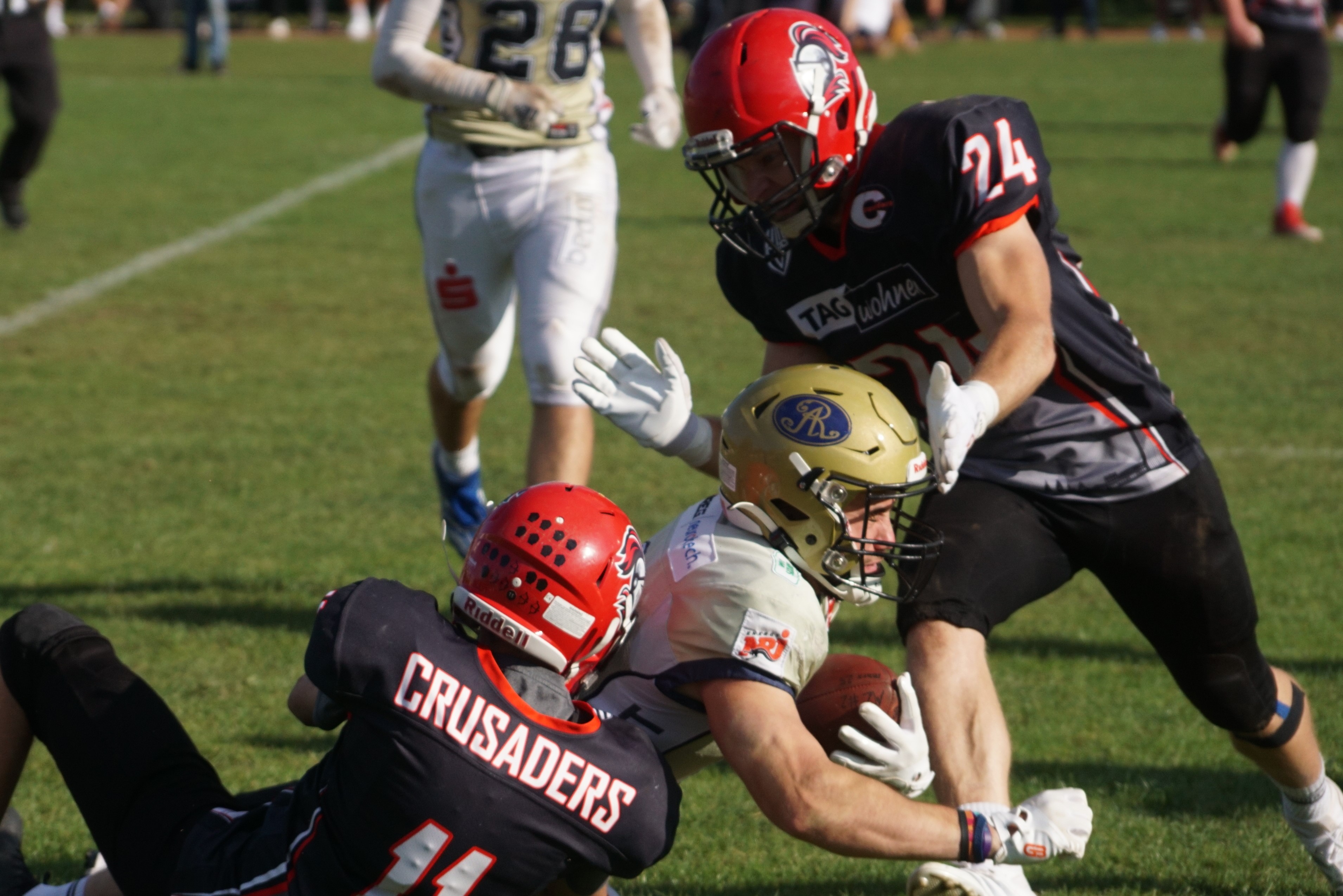 Nach der Pause machte die Chemnitzer Defense dort weiter wo sie aufgehört hatte und schickte die Gäste aus Dresden schnell wieder vom Feld. Aber auch die Dresdener Defense kam nun besser zur Geltung. So verhinderten sie nun mit einer Interception in der eigenen Endzone weitere Punkte für Chemnitz. Selbst gelangen aber keine Punkte, so dass schließlich die Chemnitzer Offense wieder auf das Feld kam. Nick Henschel (#81) war nun bereits auf und davon in die Endzone unterwegs gewesen, doch Strafen machten dies zunichte. Schließlich trennten sich die Chemnitz Crusaders erstmalig per Punt durch Dominique Ittner (#30) vom Angriffsrecht. Dabei gelang es, die Dresdener Offense an der eigenen 1-Yard-Linie auf das Feld zu zwingen. Es kam wie es kommen musste. Die Chemnitzer Defense übte enormen Druck aus und Luca Engelmann (#90) konnte den Dresdener Ballträger noch in dessen Endzone stoppen - Safety und zwei Punkte zum 29:8 für Chemnitz. Die Defense-Reihen bestimmten das Geschehen. Die Chemnitzer Offense verlor mit beginnendem 4. Viertel den Ball durch ein Fumble während bei den Dresdenern ein Touchdown aufgrund Strafen nicht gegeben wurde. In diesem Stile lief das Spiel weiter. Als dann Runnigback Florian Fritzsche (#21) wieder einmal mit einem schönen Laufspielzug unterwegs war, geschah das Unerwartete. Eine Flagge flog wegen einem Targeting - allerdings gegen den Chemnitzer Runningback. Diese harte Strafe ist mit einer gleichzeitigen Disqualifikation verbunden. Nachdem sich die Chemnitz Crusaders per Punt wieder vom Angriffsrecht getrennt hatten, nahm die Offense der Gäste noch einmal Fahrt auf und konnte die sich durch diverse Rotationen auf Chemnitzer Seite bietende Gelegenheit zum letzten Touchdown des Tages nutzen. Mit 29:14 endete schließlich das Spiel.