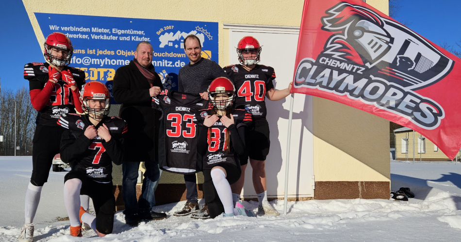 Am Sonntag, den 11. Januar, erfolgte im Rahmen des Equipmentdays die offizielle Übergabe der neuen Trikots für die B-Jugend-Spieler der Chemnitz Claymores. Der neue Trikotsatz wurde großzügig von der Arnold Immobilienservice GmbH gesponsert, einem kompetenten Dienstleistungspartner rund um den Kauf- und Verkauf, die Vermietung sowie die Sanierung von Immobilien (Link). Der sportbegeisterte Geschäftsführer Gerold Arnold unterstützt schon seit vielen Jahren finanziell kleine Vereine und Chemnitzer Schulen. Auf American Football war er erstmals aufmerksam geworden, als ihn ein Geschäftspartner vom Bundesverband mittelständische Wirtschaft (BVMW) zu einem Football-Heimspiel in Chemnitz einlud. So wurden auch dessen Kinder vom Football-Fieber gepackt, sodass der älteste Sohn mittlerweile seit 2023 als Runningback fester Bestandteil der Chemnitz Claymores ist.